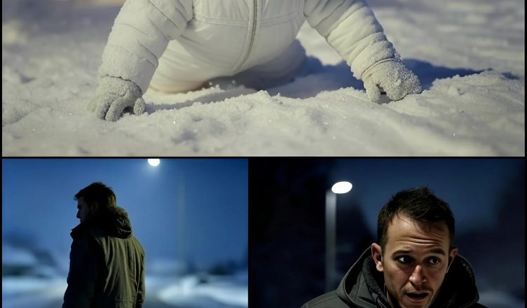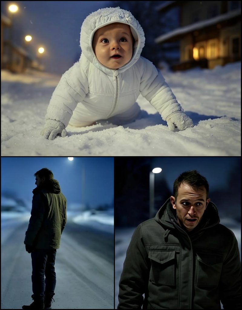 A one-year-old child, barefoot, crawling slowly along the icy highway. Shivering. Wrapped in a loose, wet blanket. His little hands scraped the road as he moved forward, unaware of the danger around him. His face was pale, but his eyes were open. Alive. Awake.