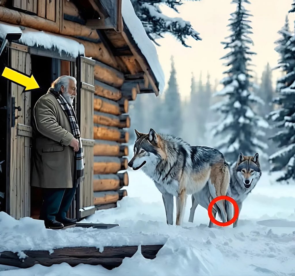 The adult wolves, moving cautiously, nudged the pups forward toward the warm light, then retreated into the shadows of the forest without a sound.